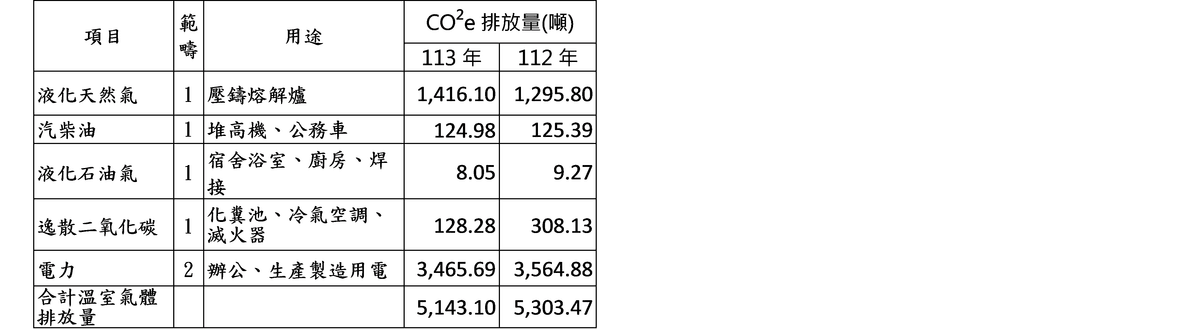 面臨地球暖化情形日趨嚴重,本公司深知溫室氣體管理工作之重要性,故本公司2021年起自願進行每季溫室氣體排放量申報,掌握溫室氣體排放來源與特性,做好自我節能減碳管理。溫室氣體排放源分為直接溫室氣體排放量、能源間接溫室氣體排放量與其他間接溫室氣體排放量,經排放源清查步驟,找出可能排放溫室氣體之活動及設施,列管判定是否為盤查範圍,並以盤查範疇一(直接排放)及範疇二(間接排放) 為主,範疇三尚未納入盤查。